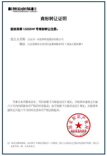 當前位置當前位置: 網站首頁   -  榮譽資質   -   川一水處理商標